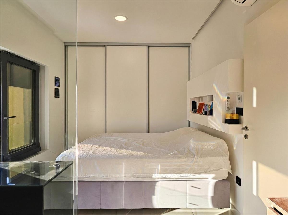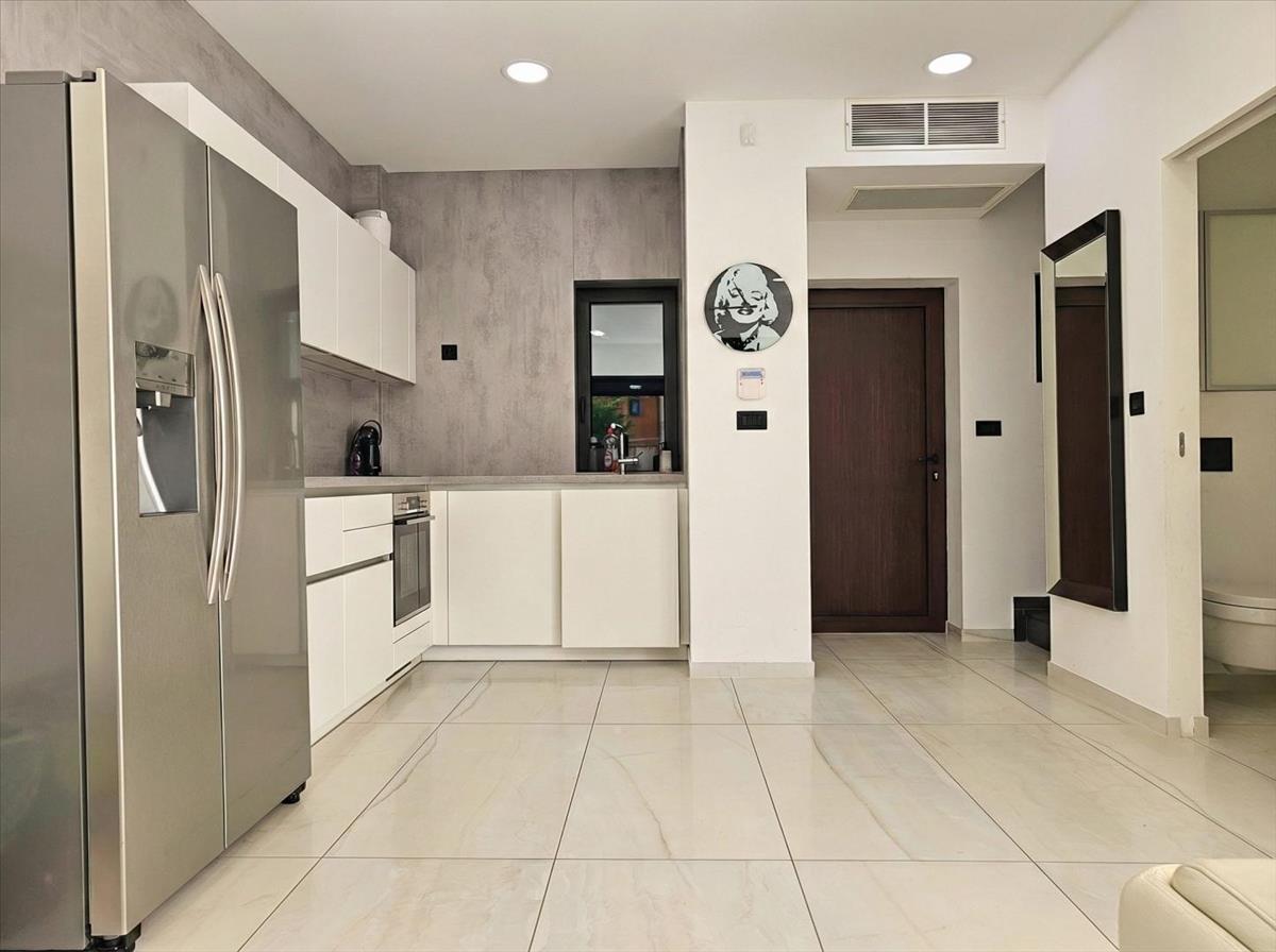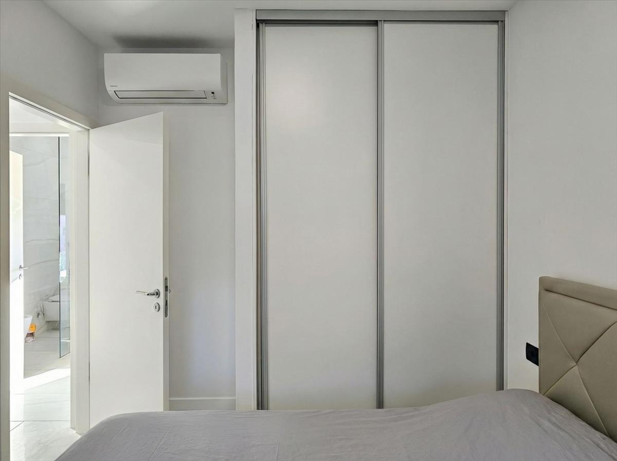 Belső lépcső vezet a felső szintre, ahol két elegáns hálószoba található, mindkettő saját fürdőszobával rendelkezik. a hálószobák teljes magasságú beépített szekrényekkel, kényelmes boxspring ágyakkal és légkondicionálóval vannak felszerelve. a szobák kellemes kilátást nyújtanak a környező városrészre és részleges tengeri kilátást kínálnak. a fürdőszobák prémium felszerelésekkel rendelkeznek, beleértve a Grohe zuhanyzókat és a Villeroy & Boch prémium szanitereket, amelyek kifinomult és modern fürdőszobai környezetet biztosítanak.