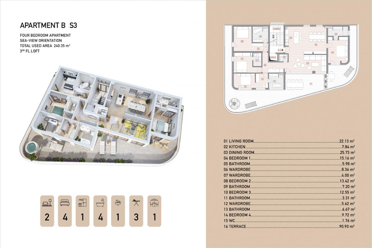 A B apartman a kínálatban - s3, a harmadik emeleten található, tágas és elegáns négy hálószobás penthouse, amely 240, 35 m² területű, tengeri tájolással. Ez az apartman négy hálószobát, négy fürdőszobát, egy külön toalettet, egy konyhát, étkezőt, egy nagy nappalit és szekrényeket tartalmaz, amelyek szinte minden hálószoba mellett találhatók. Kiemelkedő jellemzője a hatalmas 90, 90 m²-es terasz, amely ideális napozásra, szórakoztatásra és a lélegzetelállító tengeri kilátás élvezetére. a kényelem és a magánélet maximalizálására tervezett ez a penthouse tökéletes egyensúlyt kínál a luxus és a funkcionalitás között, így kivételes választás a prémium életet kereső igényes vásárlók számára az Opatijai Riviérán. Ref: RE-U-39715