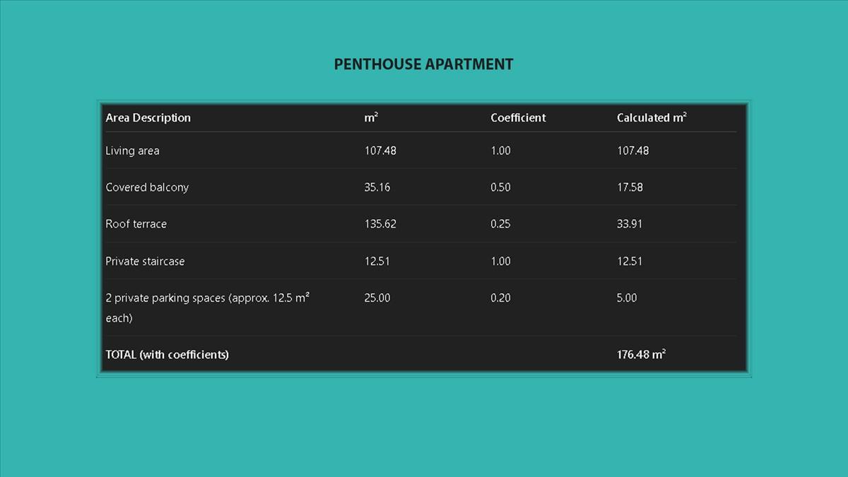 A teljes számított terület 176, 48 m², figyelembe véve az erkély, a tetőterasz és a parkolóhelyek együtthatóit.