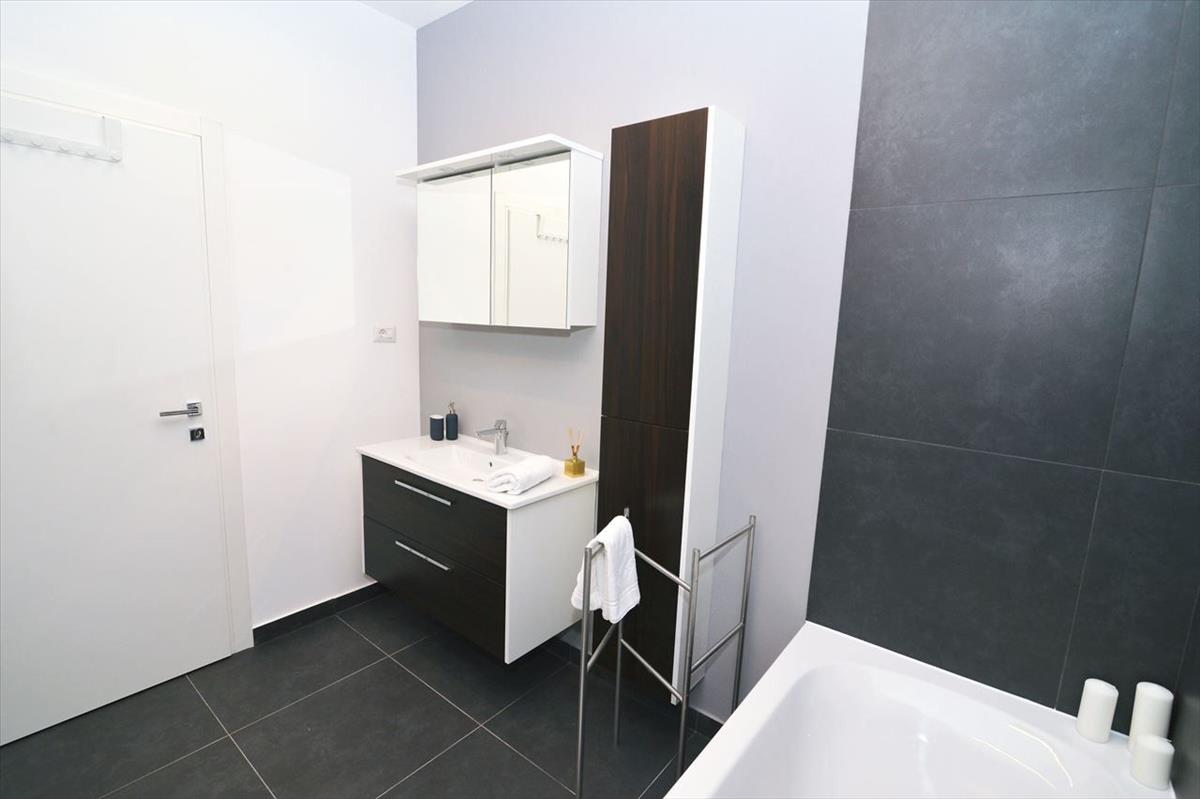 Ez a bájos apartman az épület földszintjén található, területe 94, 86 m². Tartalmaz egy előszobát, egy tágas nappalit, amely tökéletesen kapcsolódik az apartman többi részéhez, két kényelmes hálószobát, egy modern fürdőszobát, egy külön WC-t, egy tárolót és egy további folyosót, amely funkcionális elrendezést biztosít a helyiségeknek. Minden részletet gondosan megterveztek, hogy maximális kényelmet és tartózkodás minőségét biztosítsák. Az apartmanhoz egy 96 m²-es kert is tartozik.
