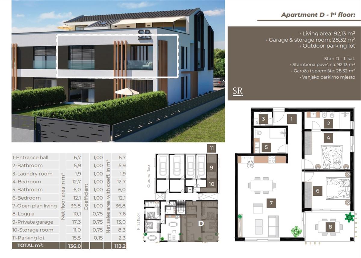 Ez a jól felszerelt lakás az első emeleten található, és két hálószobát, két fürdőszobát, tágas, nyitott nappali teret konyhával, étkezővel és nappalival, mosókonyhát, loggiát, teraszt és tárolót tartalmaz. Az ingatlanhoz garázs és egy további kültéri parkolóhely is tartozik, amely kényelmet és biztonságot nyújt.