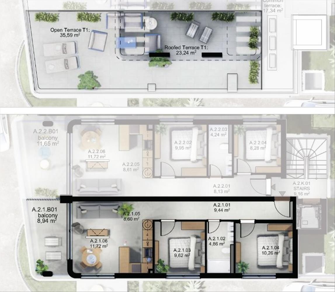 A2. 1 Penthouse, amely az a épület második emeletén található, 79, 49 m² gondosan megtervezett és finomított lakóterületet kínál. Az apartman egy bejárati előszobát, két kényelmes hálószobát, egy fürdőszobát és egy tágas, nyitott nappali teret tartalmaz, amely konyhával és étkezővel rendelkezik, mindezek zökkenőmentesen kapcsolódnak egy teraszhoz, ahonnan nyílik a tengerre néző kilátás.