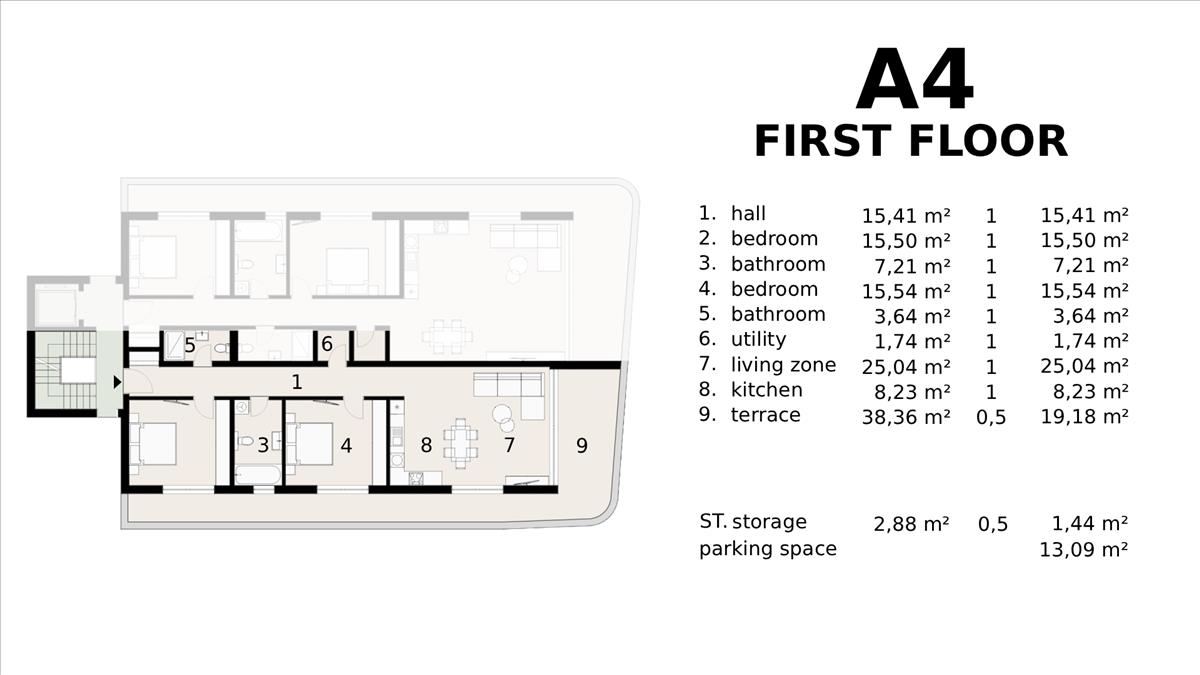 Opatija, Ičići – Eladó egy luxus apartman tágas terasszal és akadálytalan panorámás tengerre néző kilátással, tökéletesen elhelyezve mindazok számára, akik prémium apartmant szeretnének vásárolni Opatijában, vagy a legjobb minőségű ingatlanba kívánnak befektetni az Opatijai Riviérán.Ez az elegáns, két hálószobás lakás nagy terasszal a tengerre és az aci kikötőre néz, egy exkluzív lakókomplexumban található, közös medencével és egy földalatti garázzsal, mindössze egy rövid sétára a parttól. a fejlesztés hét prémium apartmanból áll, amelyeket a kortárs építészet, a kifinomult részletek és a kiváló anyagok jellemeznek, amelyek tartós minőséget biztosítanak. a csendes környezet magánéletet és nyugalmat kínál, miközben könnyen elérhető közelségben van a strandok, a kikötő, az éttermek és az Opatijai Riviéra teljes varázsa—kiváló lehetőség mindazok számára, akik Opatijában eladó ingatlant vagy Ičićiben vásárolni kívánt apartmant keresnek. Az A4-es apartman az első emeleten található, két hálószobával, két fürdőszobával és összesen 112, 93 m² nettó területtel (koefficienseket is beleértve). a belső tér 92, 31 m², amelyet egy 38, 36 m²-es terasz (19, 18 m² koefficiensekkel), egy 2, 88 m²-es tároló (1, 44 m² koefficiensekkel) és egy 13, 09 m²-es garázshely egészít ki. Az apartman gondosan megtervezett, hogy maximális kényelmet és modern mediterrán életstílust biztosítson. Tartalmaz egy tágas előszobát, egy tárolót, két elegáns hálószobát, két luxus fürdőszobát és egy nyitott nappalit, amely a konyhát, az étkezőt és a nappalit ötvözi, mindezek egy nagy teraszra nyílnak, amely invitál a reggeli kávéra, az esti pihenésre vagy a lélegzetelállító kilátással rendelkező összejövetelekre az Adrián. a tágas terasz ideális szórakoztatásra vagy egyszerűen a Kvarner felett lebegő varázslatos naplementék élvezetére, míg a világos és szellős nappali funkcionalitást és kényelmet kínál a mindennapi élethez. Az ingatlan prémium jellemzőkkel van felszerelve, mint például egy szellőző homlokzat, amely az hatékonyságot időtlen eleganciával ötvözi, Wicona alumínium nyílászárók integrált riasztóval, hőszivattyús rendszer a fűtéshez és meleg vízhez, padlófűtés az egész lakásban, diszkréten integrált légkondicionáló egységek, kiváló minőségű fa padlók, prémium csempék, betörésgátló ajtók, teljes riasztórendszer, EV-kész garázshely és lift, amely összeköti a földalatti garázst minden szinttel. a helyszín magánéletet és nyugalmat biztosít, miközben csupán néhány perc sétára van a strandtól és a kikötőtől, gyors hozzáférést biztosítva Opatija központjához. Ideális a luxus tengerparti élethez, nyaralóként vagy prémium befektetésként turisztikai bérléshez—tökéletes mindazok számára, akik Opatijában eladó apartmant vagy exkluzív ingatlant keresnek az Opatijai Riviérán. Az ár tartalmaz egy teljesen befejezett, kulcsrakész apartmant bútorok nélkül. Az áfa benne van, és a vevő mentesül az ingatlan átírási adó alól. a Horvátországban bejegyzett cégek teljes ÁFA-visszatérítést igényelhetnek. Ez a projekt megtestesíti a mediterrán életstílust, amelyet a fény, a természet és a luxus határoz meg—ideális otthon azok számára, akik többre vágynak, mint csupán egy ingatlan. Ref: RE-U-43963