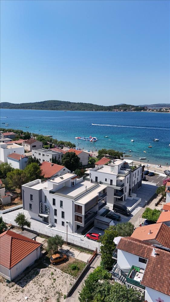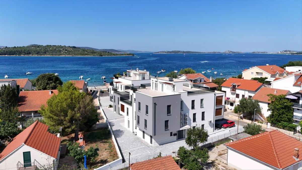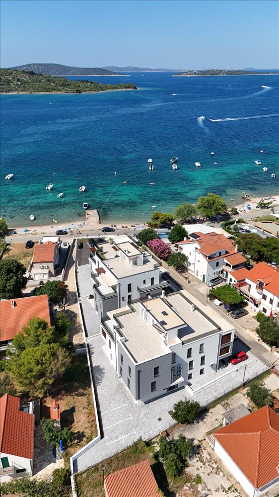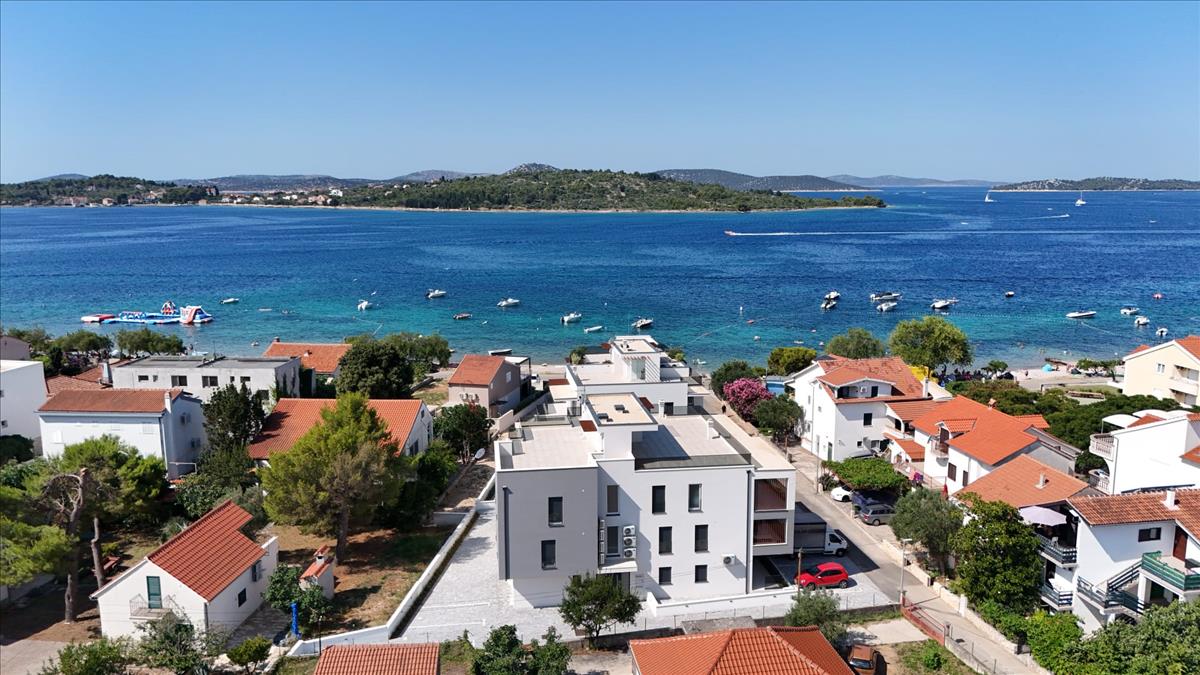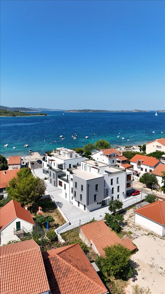 Új, modern projekt luxus apartmanokkal, az első sorban a tenger felé, közvetlenül a tengerparton, Vodice külvárosában, cca 2, 5 km-re Vodice központjától és 10 km-re Sibenik városközpontjától.