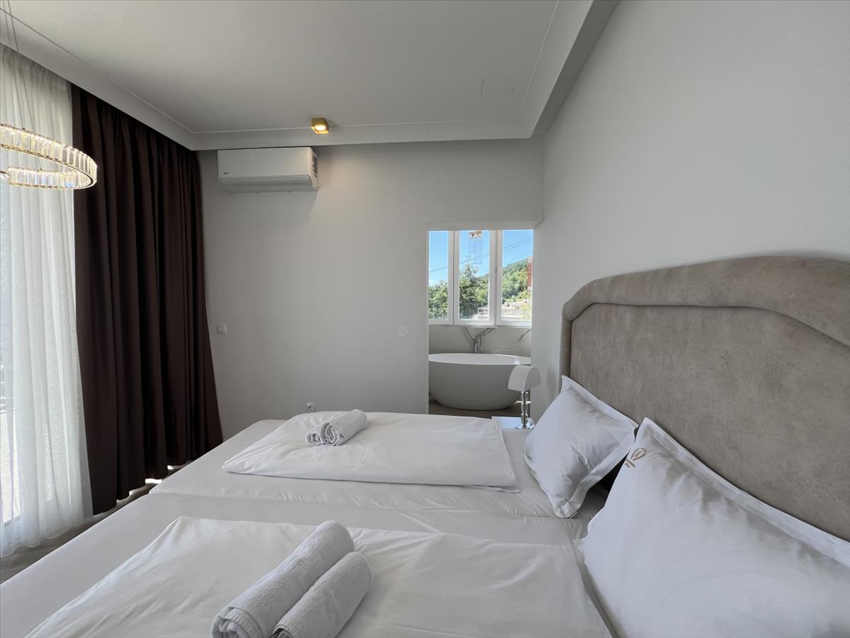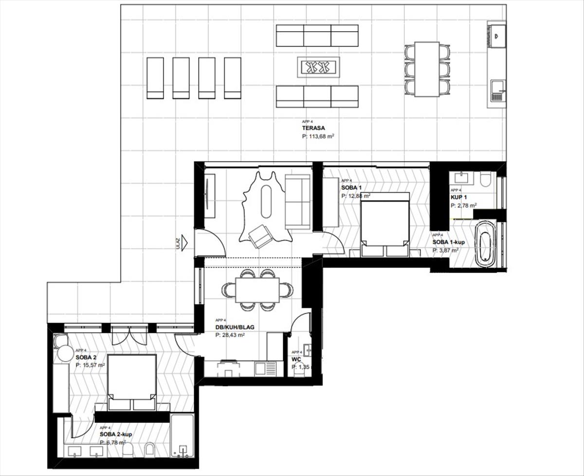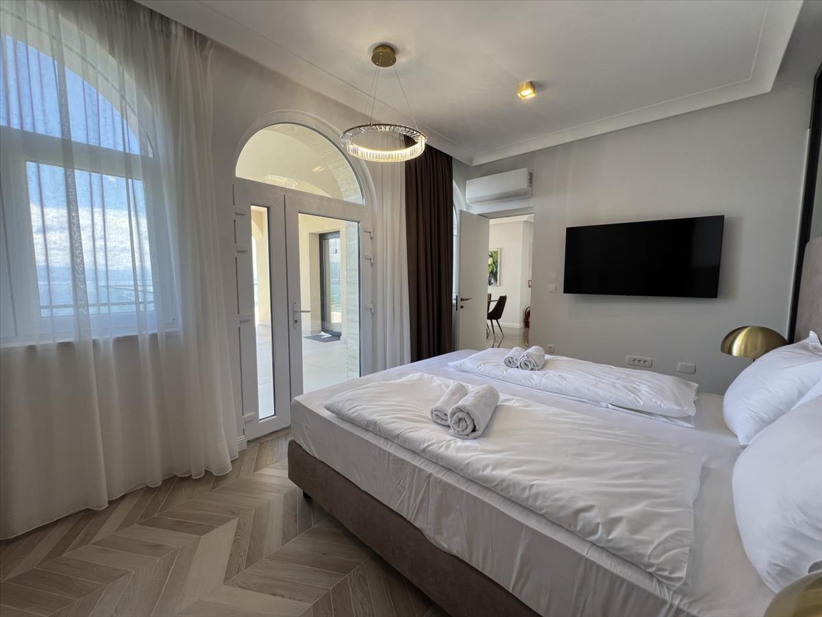 Ez a konkrét lakás 71, 66 négyzetméter belső térrel és egy 113, 68 négyzetméteres tágas terasszal rendelkezik, összesen 185, 24 négyzetmétert kínálva a kényelem és a pihenés érdekében. Belül egy nyitott nappali található konyhával és étkezővel, két hálószoba, mindkettő saját fürdőszobával és teraszra való kijárattal, valamint egy további vendég wc. a lakás szabadság és luxus érzését nyújtja, így jól alkalmas akár magánéletre, akár turisztikai bérlésre.