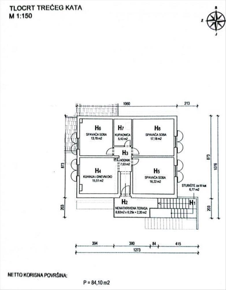 A második lakás a harmadik emeleten található, a lakás lakóterülete 84, 10 m2 és egy előszoba, étkezős konyha, nappali, két hálószoba és egy wc található benne.