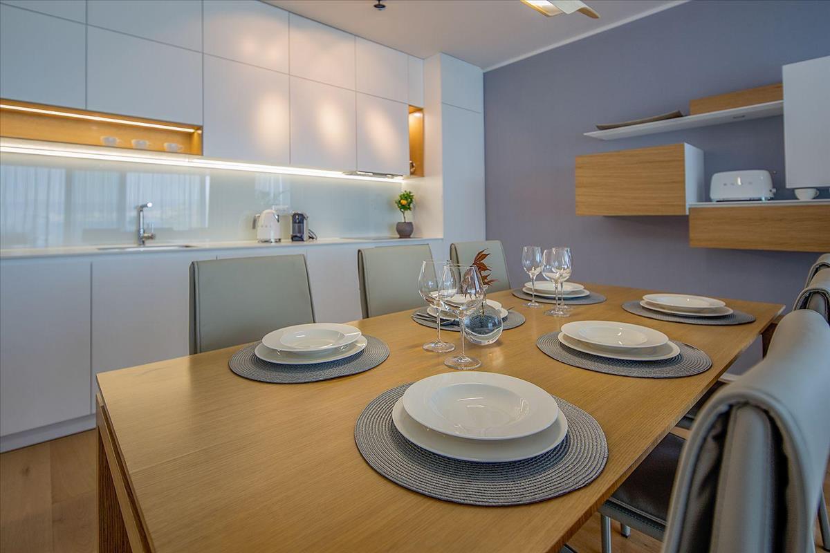 Belépve egy tágas folyosó fogadja az embert, amely egy tágas hálószobába és elegánsan kialakított fürdőszobába vezet. a nappali, egy világos és hívogató tér, zökkenőmentesen egybeolvad a legkiválóbb anyagokból készült modern konyhával, amelyhez a szórakozáshoz tökéletes étkező tartozik. Mégis a terasz az, ami igazán megkülönbözteti ezt a lakást – egy csodálatos, tágas tér, ahonnan panorámás kilátás nyílik a tengerre és a Kvarner-öbölre, ahol megízlelheti egy reggeli kávé egyszerű örömét, vagy sütkérezhet az esti nyugalomban. a csillagok alatt.