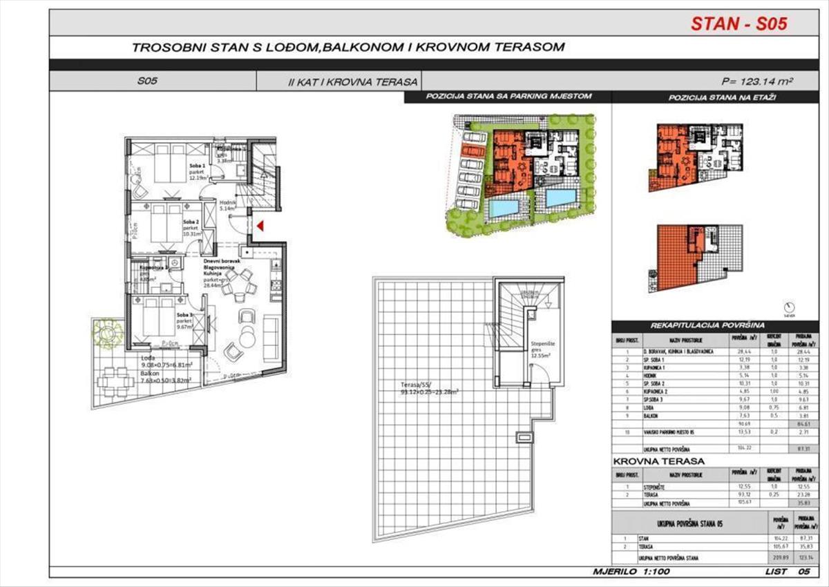 A második emeleten található, összesen 123, 14 m2 hasznos alapterületű penthouse nappaliból, konyhából és étkezőből, három hálószobából, két fürdőszobából, előszobából, erkélyből és egy tágas, 93, 12 m2-es tetőteraszból áll. , Ahonnan lenyűgöző kilátás nyílik a tengerre, és egy privát lépcsőn keresztül közelíthető meg. Az ingatlanhoz tartozik még egy parkolóhely az épület udvarán.
