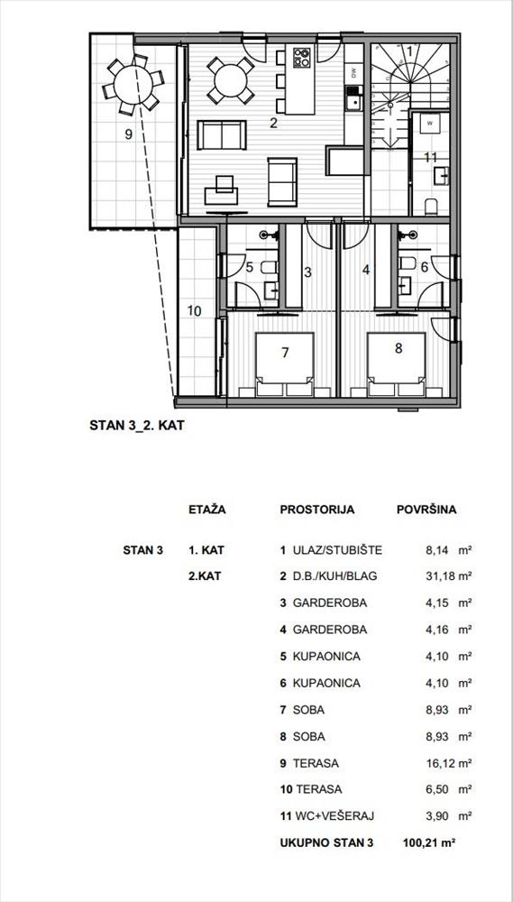 Ez a luxus lakás 116, 25 m² alapterületű, és egy három lakásos lakóépület második emeletén található. Tartalmaz egy előszobát, egy vendég toalettet és mosókonyhát, egy nyitott konyhát étkezővel és nappalival, valamint két hálószobát, mindkettő saját fürdőszobával és gardróbbal rendelkezik. a lakás két terasszal rendelkezik, tengeri kilátással - egy nagyobb, amely a nappaliból nyílik, és egy kisebb, amely az egyik hálószobából megközelíthető.