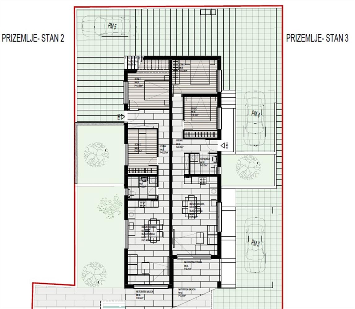 Jellemzők: Három hálószoba saját fürdőszobával, további wc, mosókonyha, tágas nappali konyhával és étkezővel