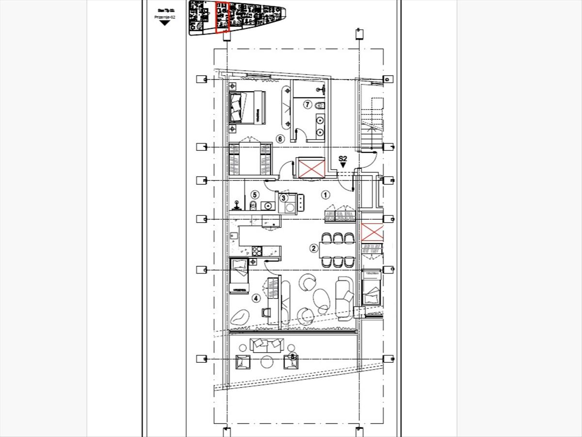 A S2-es lakás a földszinten található, összes nettó területe 127 m² (használható belső tér: 110 m², bruttó terület: 189 m², beleértve a teraszt, garázst és tárolót). Két tágas hálószobából, két modern fürdőszobából, egy teljesen felszerelt konyhából, étkezőből és egy világos nappaliból áll, amely hozzáférést biztosít egy nagy fedett teraszhoz, ahonnan lenyűgöző panorámás kilátás nyílik az Adriai-tengerre.