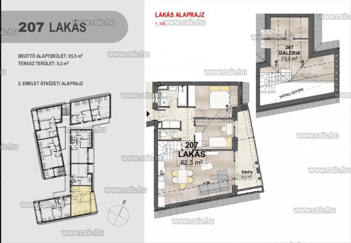 A lakás 85, 5 nm-en tágas élhető terekkel rendelkezik, 1 amerikai konyhás nappalival, 2-3 hálószobával (emeleti galérián kialakítható +1 hálószoba) külön fürdőszobával és mellékhelyiséggel, továbbá egy 5 nm-es terasszal is.