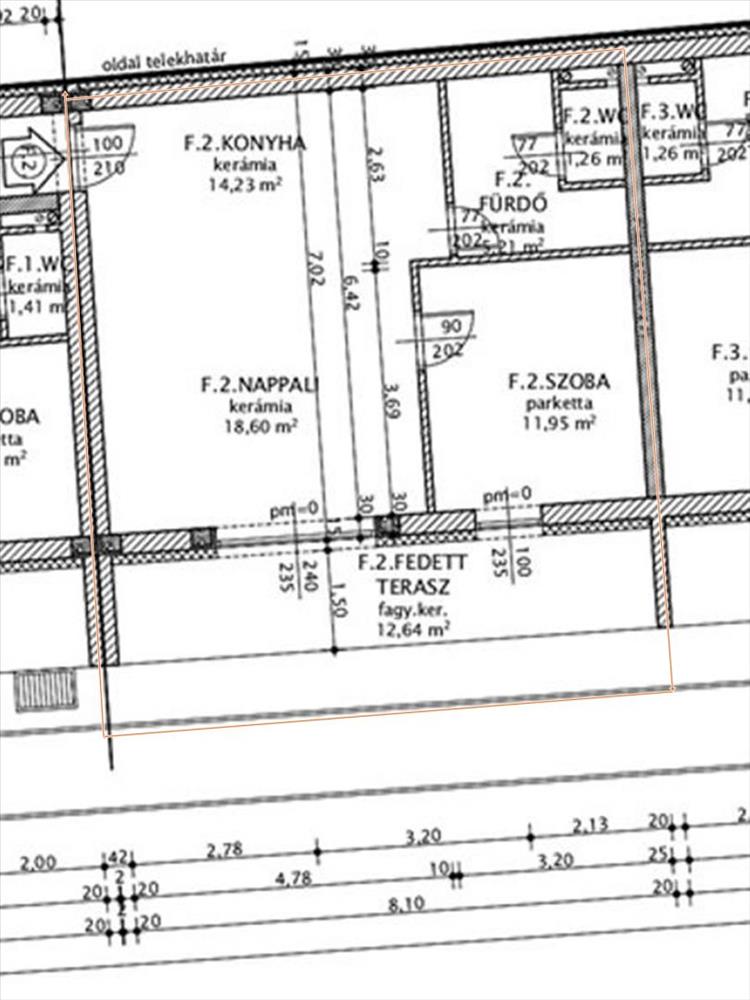 fedett terasz 12, 64 m2. Saját kert 60 m2
