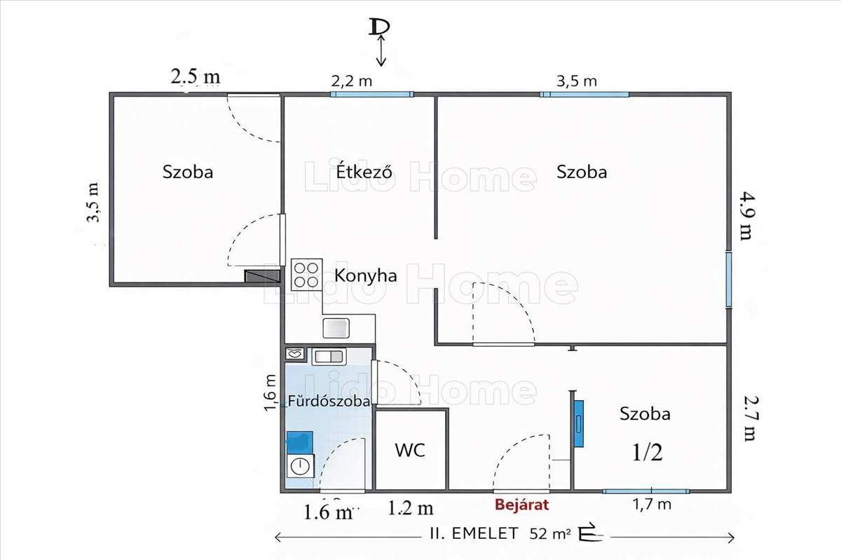 A lakásba belépve kialakításra került egy előtér, szoba+ félszoba, egy konyha+ étkező, tágas, világos nappali, fürdőszoba illetve külön wc.