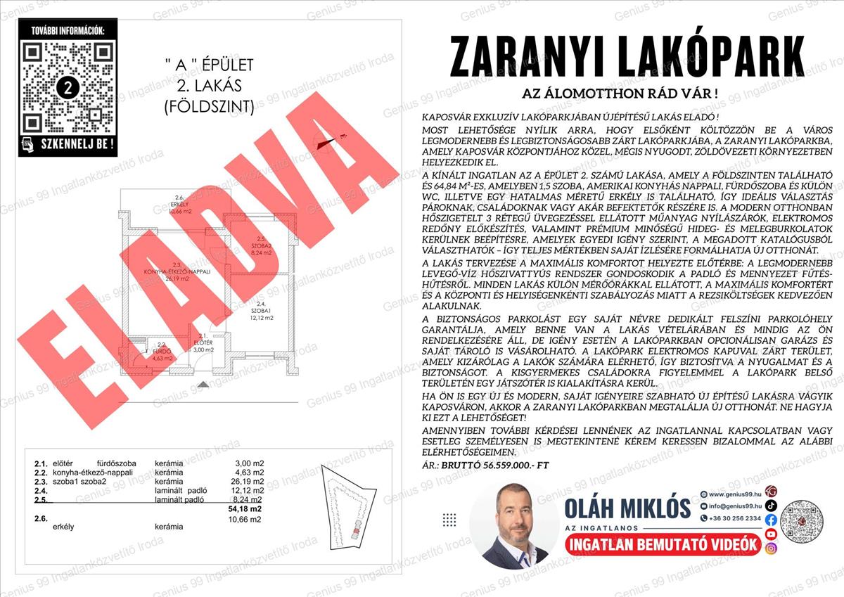 A kínált ingatlan az a épület 2. Számú lakása, amely a földszinten található és 64, 84 m²-es, amelyben 1, 5 szoba, amerikai konyhás nappali, fürdőszoba és külön wc, illetve egy hatalmas méretű erkély is található, így ideális választás pároknak, családoknak vagy akár befektetők részére is. a modern otthonban hőszigetelt 3 rétegű üvegezéssel ellátott műanyag nyílászárók, elektromos redőny előkészítés, valamint prémium minőségű hideg- és melegburkolatok kerülnek beépítésre, amelyek egyedi igény szerint, a megadott katalógusból választhatók – így teljes mértékben saját ízlésére formálhatja új otthonát.