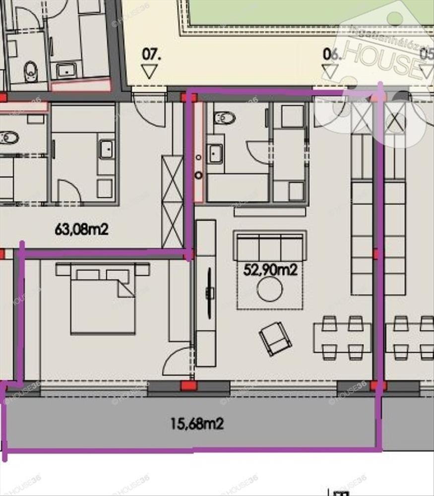 Az épület első emeletén, 52, 9 m2 lakóterű, nappali + 1 szobás lakás, 15, 68 m2 erkéllyel megvásárolható.