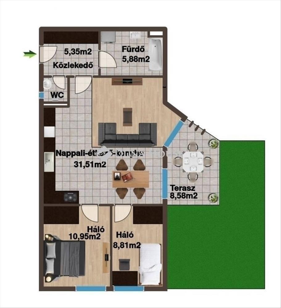 Eladó luxus kivitelű, új építésű kertkapcsolatos lakás a belvárosban! a belváros szívében kínálunk megvételre, belső udvaros 9 lakásos társasházban egy 64, 42 m² alapterületű, új építésű, prémium minőségben kivitelezett, kertkapcsolatos, amerikai konyhás nappali + 2 hálószobás lakást, melyhez 8, 58 m²-es terasz tartozik. a lakás kialakítása modern és letisztult, magas műszaki tartalommal: Bukó-nyíló és fix nyílászárók, szúnyoghálóval és rejtett redőnytokkal a konyhában, fürdőszobában, WC-ben és előtérben kőporcelán burkolat a szobákban és a nappaliban laminált parketta színharmonikus szegélyléccel (31-es vagy 32-es kopásállóság) Fürdőszobában és WC-ben mennyezetig érő mázas kerámia falburkolat Glettelt falak, fehér diszperziós festésselPrémium szaniterek és szerelvények: Porcelán mosdók és kézmosók Kludi Active egykaros mosdócsapok, kerámiabetéttel, állítható hőfokkorlátozóval Falsík előtti Geberit Duofix wc, porcelán mélyöblítésű WC-csészével Geberit Sigma fehér nyomólap, fehér solinar WC-ülőkeModern, energiatakarékos gépészet: Fűtés levegő/víz hőszivattyúval a lakás teljes területén padlófűtés Programozható központi és helyi, fali fűtésvezérlőről szabályozható fűtésGarázs vagy autóbeálló külön vásárolható az ingatlanhoz. Ideális választás mindazok számára, akik belvárosi elhelyezkedést, korszerű műszaki megoldásokat és luxus kivitelezést keresnek egy kertkapcsolatos otthonban.