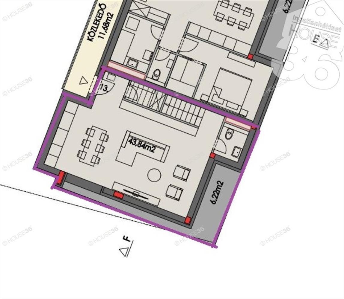 Az épület első emeletén, lakáson belül kétszintes, bruttó 97, 16 m2, nettó 88, 24 m2 lakóterű, nappali + 2 szobás lakás, 12, 44 m2 dupla erkéllyel megvásárolható, mely külön lépcsőházból elérhető ahol nincs lift.
