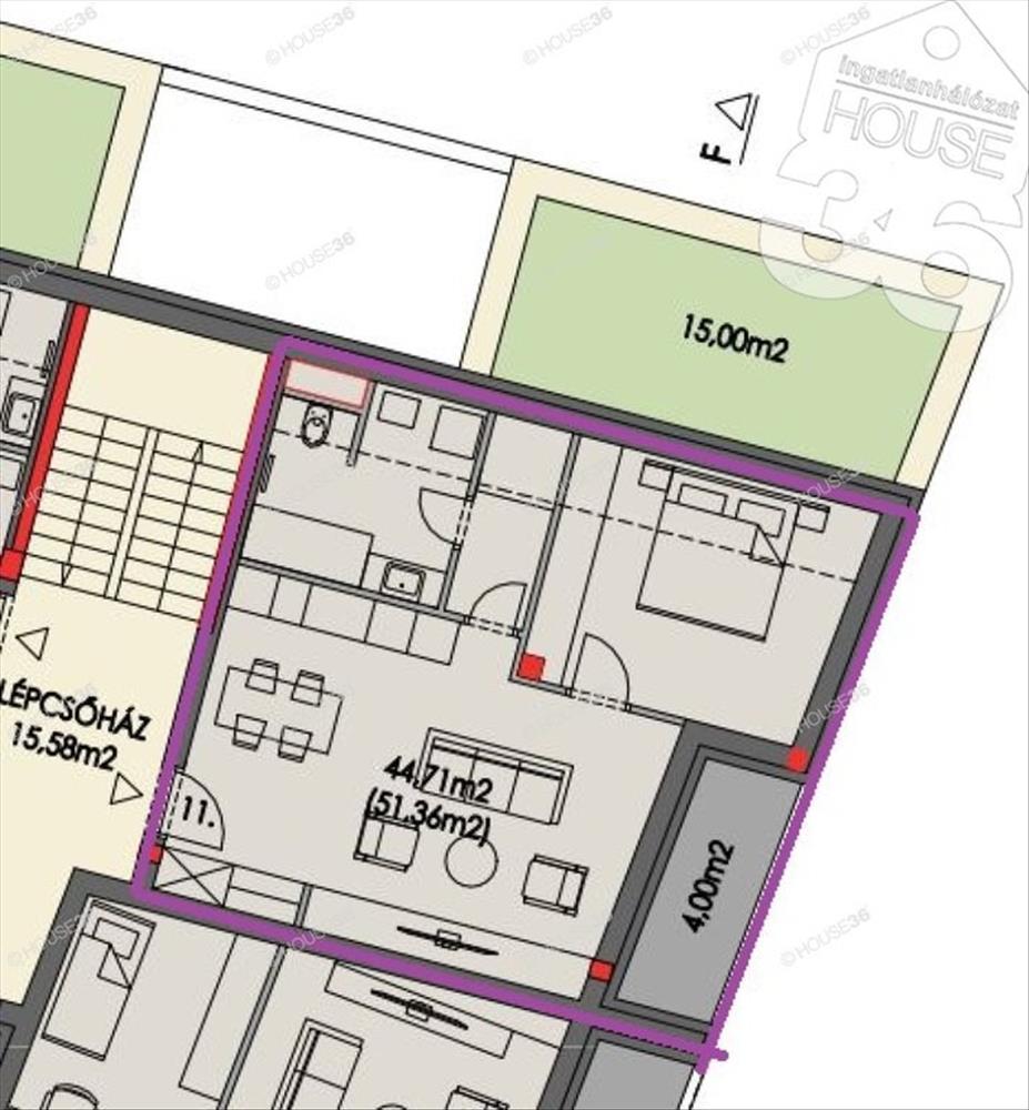 Az épület első emeletén, bruttó 51, 36 m2, nettó 44, 71 m2 lakóterű, nappali + 1 szobás lakás, 4 m2 erkéllyel megvásárolható, mely külön lépcsőházból elérhető ahol nincs lift.