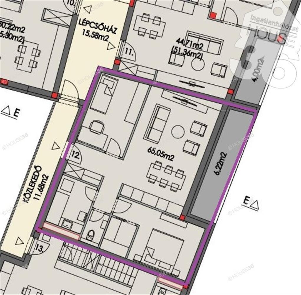 Az épület első emeletén, 65, 05 m2 lakóterű, nappali + 2 szobás lakás, 6, 22 m2 erkéllyel megvásárolható, mely külön lépcsőházból elérhető ahol nincs lift.