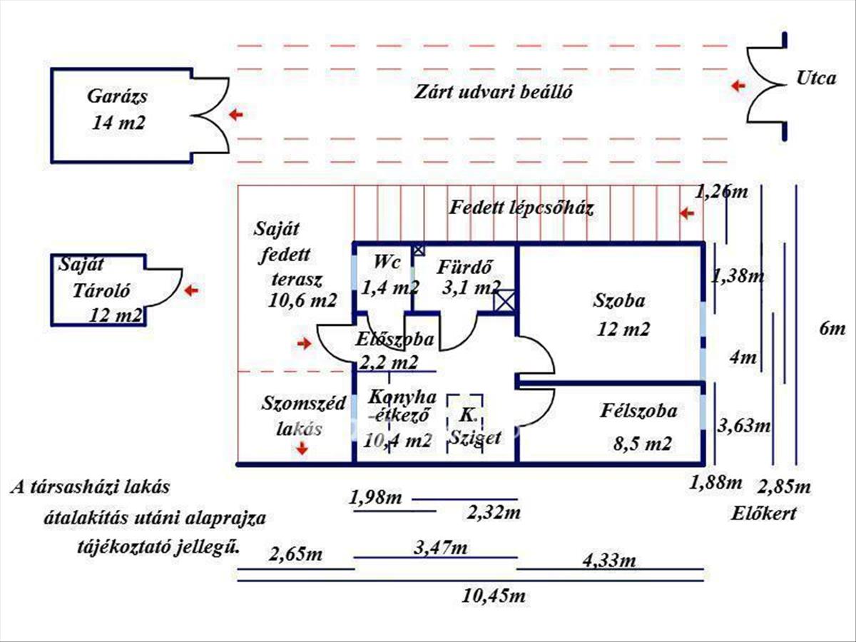 Bács-Kiskun vármegye, Kecskemét, Műkertvárosi részen 38 m2 hasznos alapterületű tégla építésű 1. emeleti társasházi lakás eladó. Az 1980-ban épült, kettéosztott 8 lakásos társasház a városrész főútja közelében, mégis csendes utcában található. a komfortos lakásban egy szoba, egy fürdőszoba-WC helyiség, egy előszoba, egy konyha-étkező és egy kamra kapott helyet. a szoba parketta-, a többi helyiség járólap borítást kapott. Az otthon melegét gázkonvektorok biztosítják, a melegvíz ellátásáról Junkers típusú gázüzemű vízátfolyós rendszerű vízmelegítő gondoskodik. Az ingatlanhoz tartozik még egy saját használatú 10 m2 nagyságú fedett hátsó terasz, egy belső udvarról megközelíthető 14 m2 nagyságú garázs és egy különnyíló 12 m2-es saját tároló. a külső- és belső nyílászárók eredetiek, normál állapotúak. Az ingatlanban az elmúlt években néhány felújítás történt: a lapostető víz elleni újraszigetelése, a belső vízhálózat cseréje konyhai és fürdőszobai mosógép-kiállással megvalósult, valamint a saját hidegvíz- és gázmérőóra beszerelésre került. Az ablakok új redőnnyel ellátottak, a bejárati ajtó műanyagra cserélt. Az összközműves ingatlanban a részben felújított egyfázisú (16 Amper) villanyhálózat körönként szerelve, valamint a garázshoz külön kialakított egyfázisú (10 Amper) villanyvétel, a gáz, a vezetékes víz és a csatorna rendelkezésre állnak. a lakás megközelítése külső feljáratú fedett lépcsővel biztosított, a szintén fedett terasz kisebb összejövetelek megtartására is alkalmas lehet. Az otthon átalakításával különnyíló WC-helyiség, egy plusz félszoba, valamint egy konyhaszigettel kialakított étkezős konyha is kialakítható. a jelenlegi konyhabútor gépészetével a vételár részét képezheti. a belső kert egy része megállapodás szerint saját használatúvá tehető. a saját garázsbeálláson kívül az udvaron igény szerint további gépjárművek parkolása is megoldható. Az ingatlan további előnye, hogy a társasháznak nincs közös költsége. a belső udvarban lévő garázs és a tároló a lakás vételárát nem képezi, ezek együttes vételára további 6 Mft. Ideális választás családalapítás előtt álló fiatal párok és egyedülállók, valamint befektetők számára egyaránt. Elhelyezkedése kiváló, a közelben minden megtalálható: többféle bevásárlási lehetőség, rendelőintézet, patika száz méteren belül, a tömegközlekedés megoldott. a hirdetés tájékoztató jellegű, az ingatlanról pontos adatokat a megtekintést követően a tulajdonos által elmondottak alapján tudunk garantálni! a vásárlás finanszírozásában az OTP kedvezőbb kamatozású hitelkonstrukcióival és egyéb banki termékek lehetőségével tudunk segíteni. Az adásvételi szerződés lebonyolításához korrekt ügyvédi közreműködést tudunk ajánlani. Amennyiben felkeltettem érdeklődését, hívjon bizalommal! Eladó ingatlanokat keresünk meglévő és külföldi partnereink számára! FIX 3% lakáshitelre megvehető