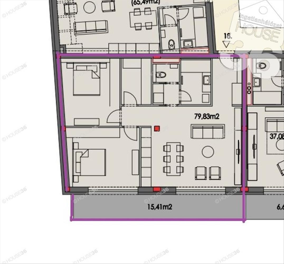 Az épület II. emeletén, 79, 83 m2 lakóterű, nappali + 2 szobás lakás, 15, 41 m2 erkéllyel megvásárolható.
