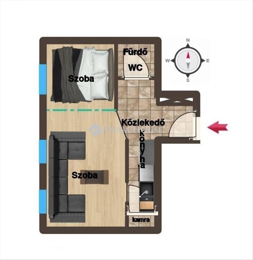 Szoba, konyha, fürdőszoba, önálló kamra, közlekedő.