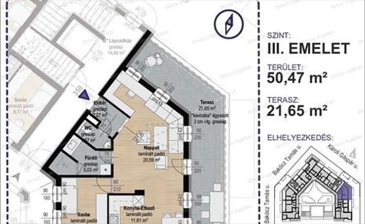 A lakás 50, 47 m2, melyhez 21, 65 m2-es terasz tartozik.