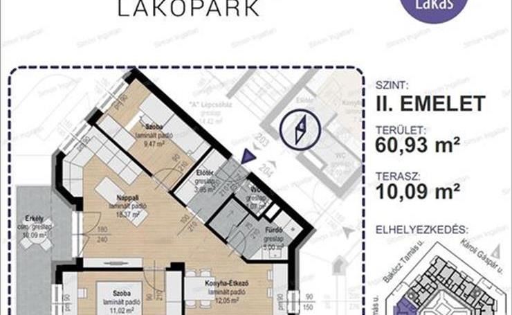 A lakás 61, 05 m2, melyhez 10, 09 m2-es terasz tartozik.