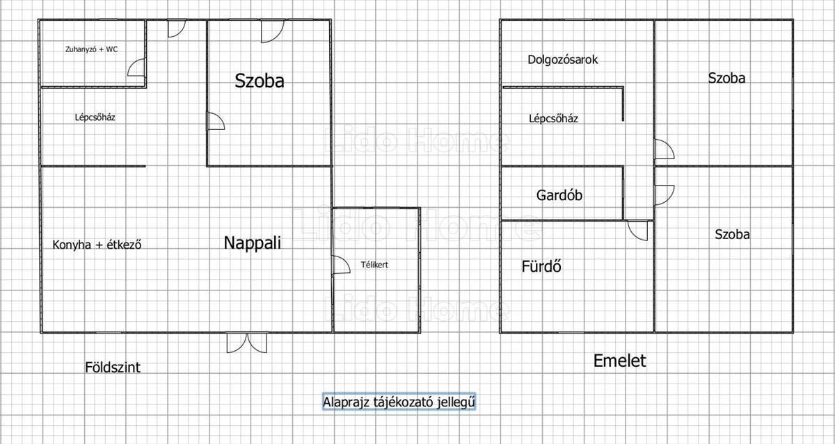 -emelet helységei: gardrób, 2 szoba, fürdőszoba káddal, mosdóval, WC-vel, és dolgozósarok