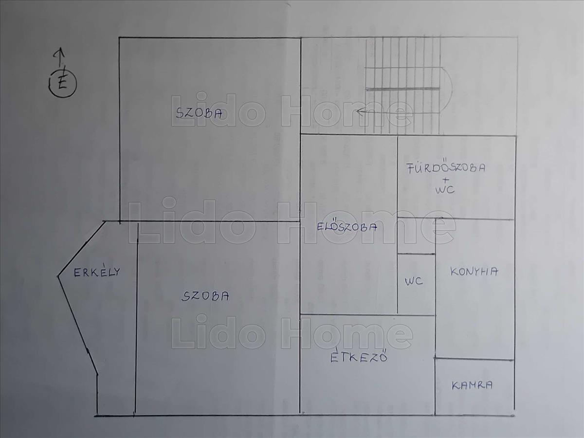 Lakás helyiségei: előszoba, 2 szoba, konyha - kamra - étkező, fürdőszoba zuhanyzóval és WC-vel, külön wc, erkély.