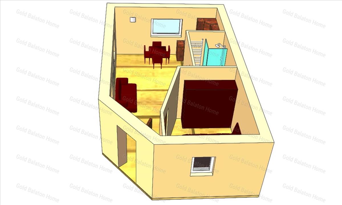 - földszint: a konyha-étkező egy légteret képez a nappalival és az előtérrel, fürdőszoba zuhanyzóval és WC-vel, hálószoba, kertre néző terasz
