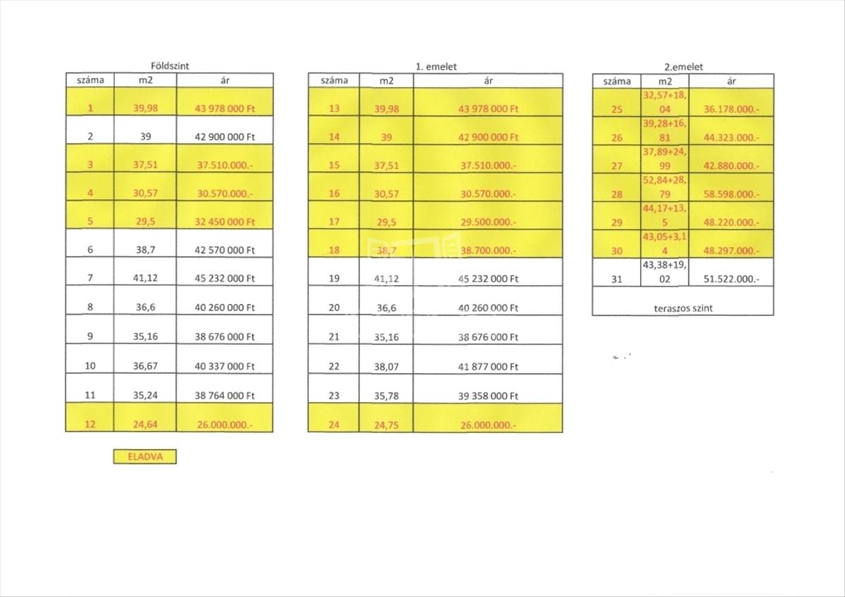 A feltüntetett ár az első emelet 21-es lakásra vonatkozik, 35, 16 m2 lakótér, helyiségei: amerikai konyhás nappali, előtér, fürdőszoba.