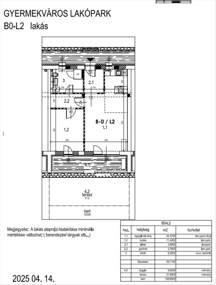 B/0-L2 lakás földszinti, 49 nm -es. Tartozik hozzá egy 9, 6 nm -es Loggia, 21, 6 nm -es Terasz, 128 nm -es saját Kert.