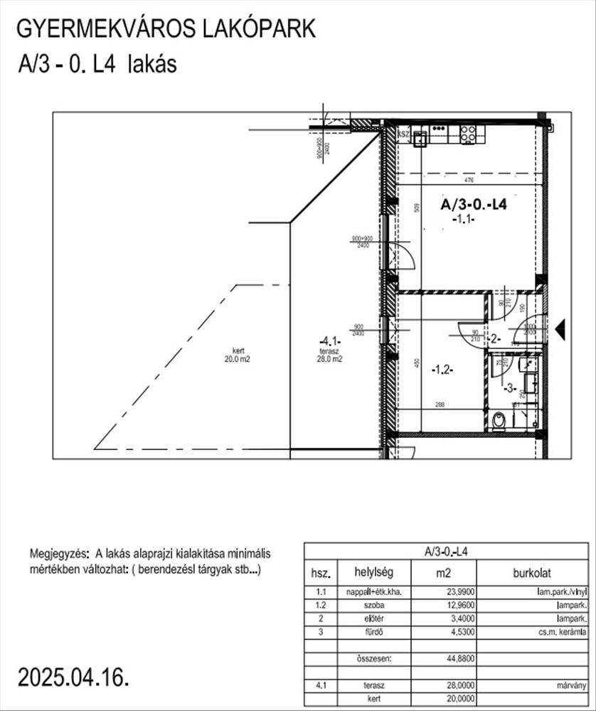 A/3-0-L4 lakás földszinti, 45 nm -es. Tartozik hozzá egy 28 nm -es terasz és egy 20 nm -es saját kert.