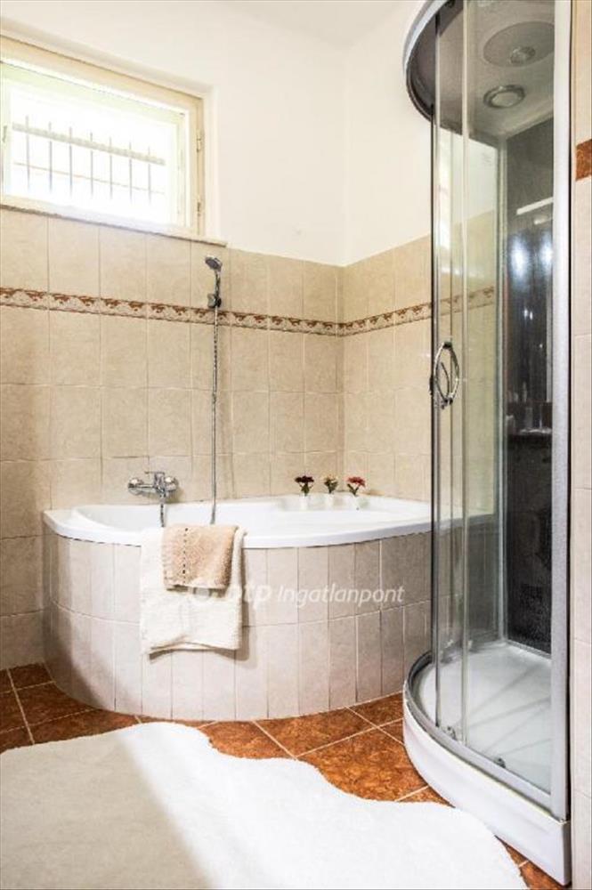 A hall másik ajtaján egy közlekedőn keresztül a stílusos, ablakkal, természetes fénnyel rendelkező fürdőszobához jutunk, melyben sarokkád és zuhany is helyet kapott. Itt is illetve a mellette lévő külön mellékhelyiségben is van wc, a lakás dupla komfortos.
