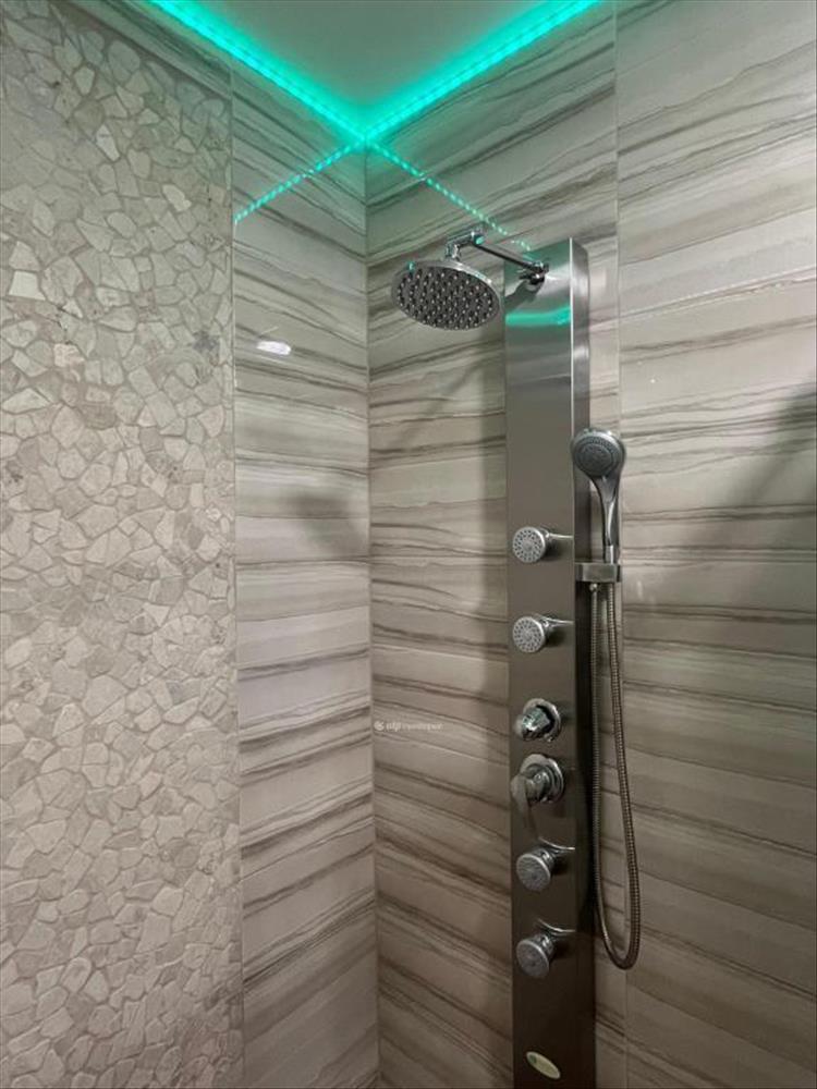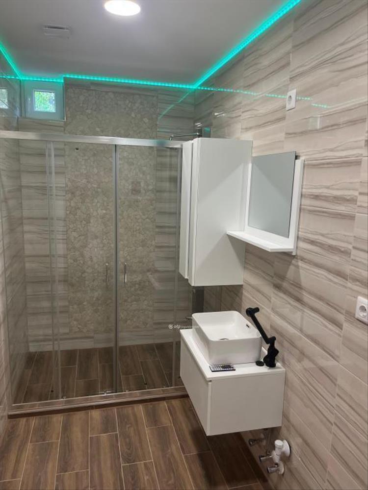 Fürdőszoba kényelmes, nagy zuhanyzóval és WC-vel kialakított, gyakorlatias és elegáns.