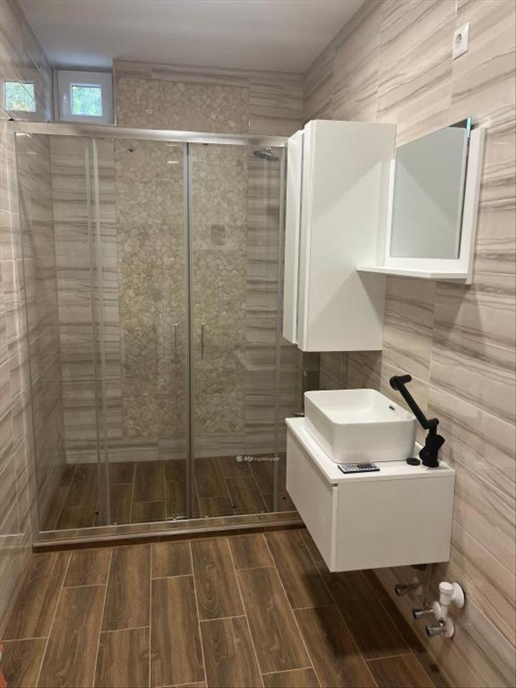 Fürdőszoba kényelmes, nagy zuhanyzóval és WC-vel kialakított, gyakorlatias és elegáns.