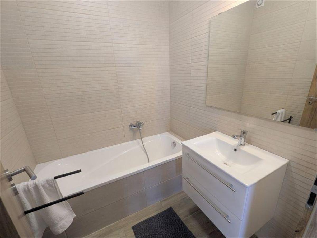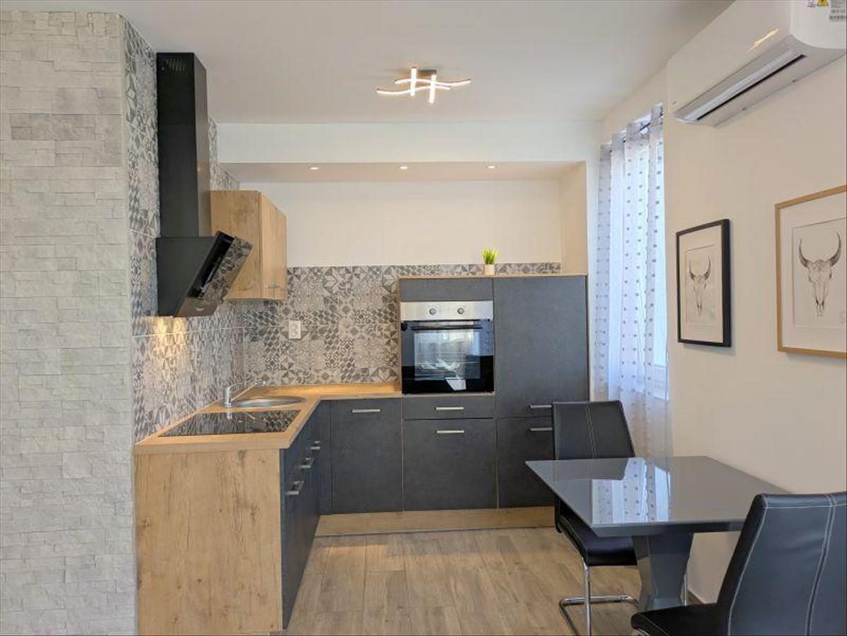 Modern kényelem: Igényes, gépesített konyha (fa és antracit kombináció), stílusos burkolatok és hűtő-fűtő klíma várja.