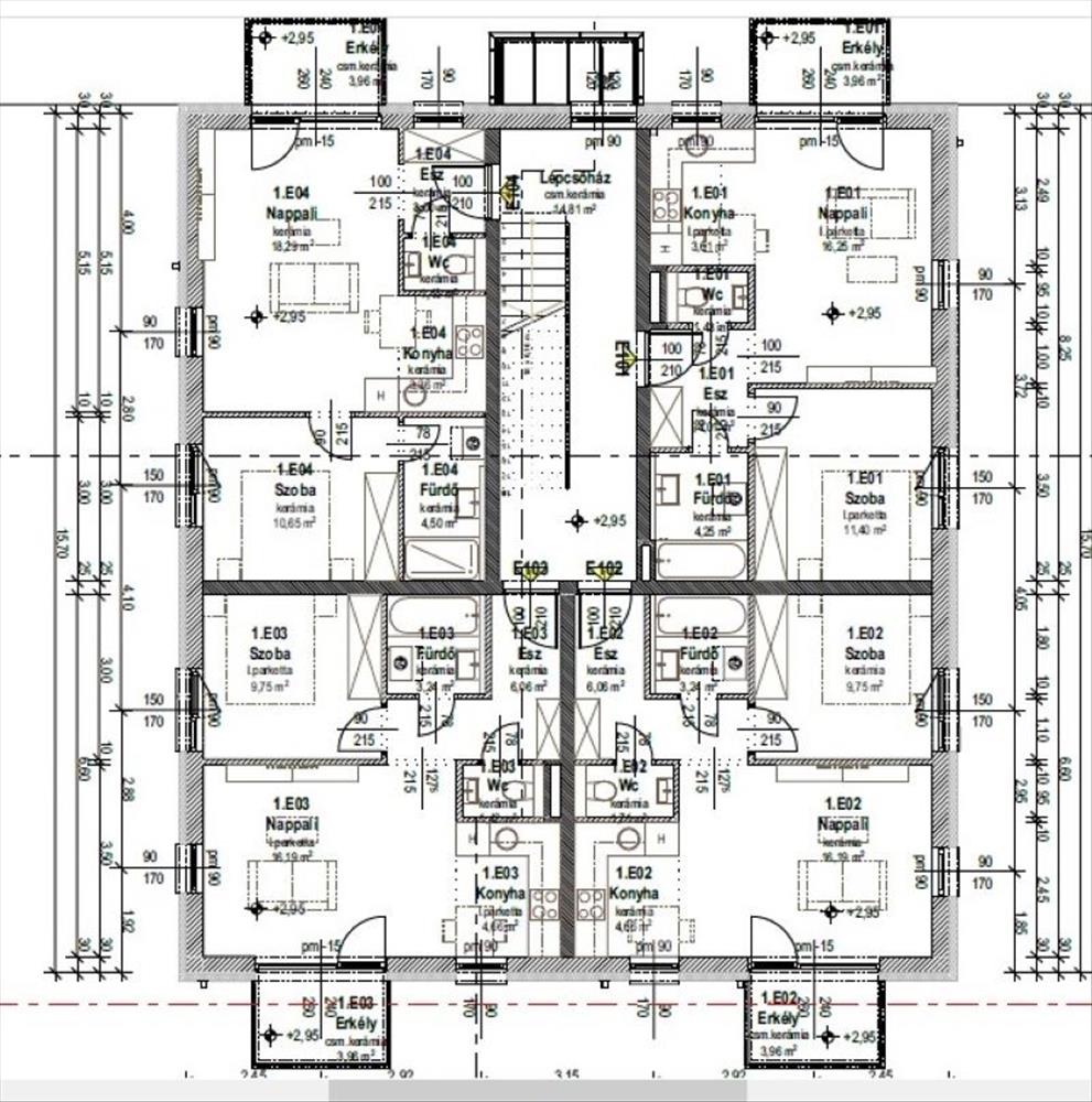 Az első emeleti lakás, 44 nm-es, felosztása: előtér, szoba, konyha-étkező-nappali, fürdő, wc, valamint egy 3, 96 nm-es erkély, mely ideális otthont biztosít pároknak vagy akár egyedülállóknak is.