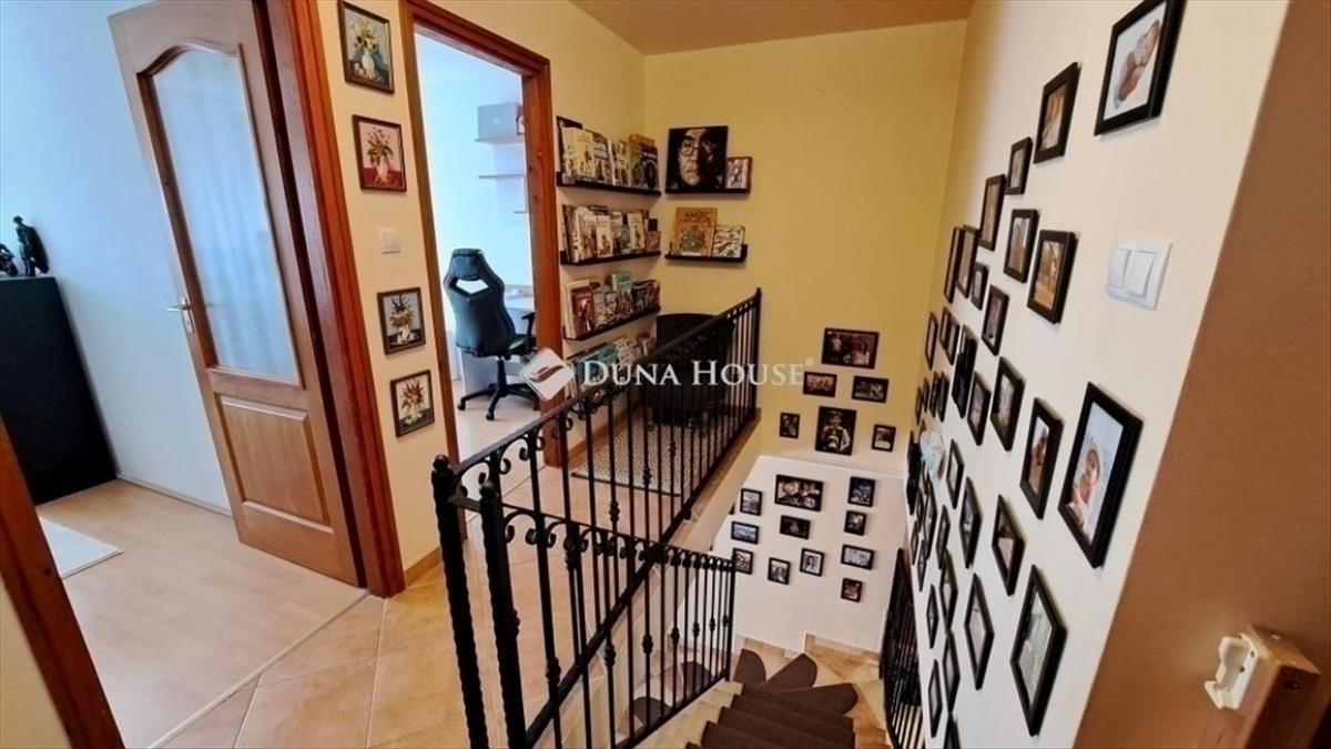 A felső szintre egy szépen kivitelezett kovácsoltvas korláttal ellátott lépcső vezet fel, ahol 3 használható hálószoba található.