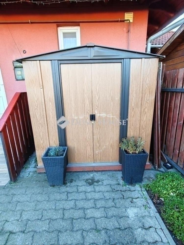 Elől 43 m2-es zárt, térkövezett rész található, ahol az autóval kényelmesen parkolhatunk, a szerszámoknak pedig egy kerti tároló áll rendelkezésre.