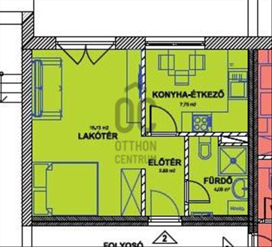 A 31 m²-es földszinti lakás nappali–háló funkcióval egyben világos, barátságos teret kínál, ahol kényelmesen elkülöníthető a pihenő- és az élettér.