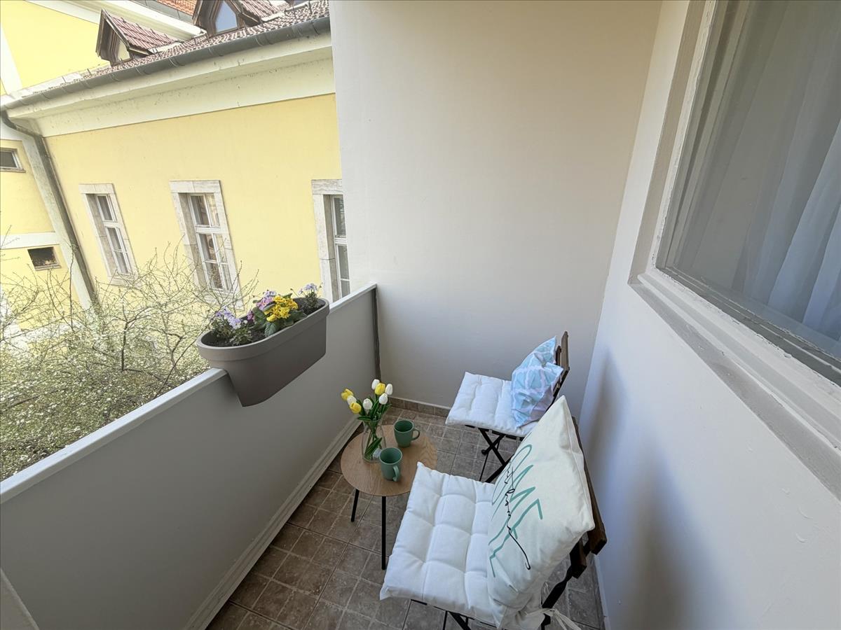 Az alsó szinten kapott helyet a nappali, a konyha, valamint egy különálló mellékhelyiség, míg a felső szinten két külön nyíló szoba és a fürdőszoba található. a nappaliból nyíló közel 2 m²-es loggia kellemes kiegészítője a lakásnak, amely tökéletes egy nyugodt reggeli kávéhoz vagy egy kellemes esti beszélgetéshez. a szobák déli tájolásúak, így világosak, napfényesek, ráadásul közvetlen rálátást biztosítanak a sétálóutcára és a színházra, ami igazán egyedi hangulatot ad az ingatlannak.
