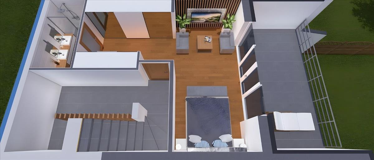 A 143, 83 m²-es, háromszintes lakás átgondolt elrendezésének köszönhetően ideális választás családok számára. a kényelmes utcaszinti bejárattól és garázstól indulva a privát hálószobákon át jutunk el a világos, kertkapcsolatos nappalihoz, amely a mindennapi élet központi tere lehet.