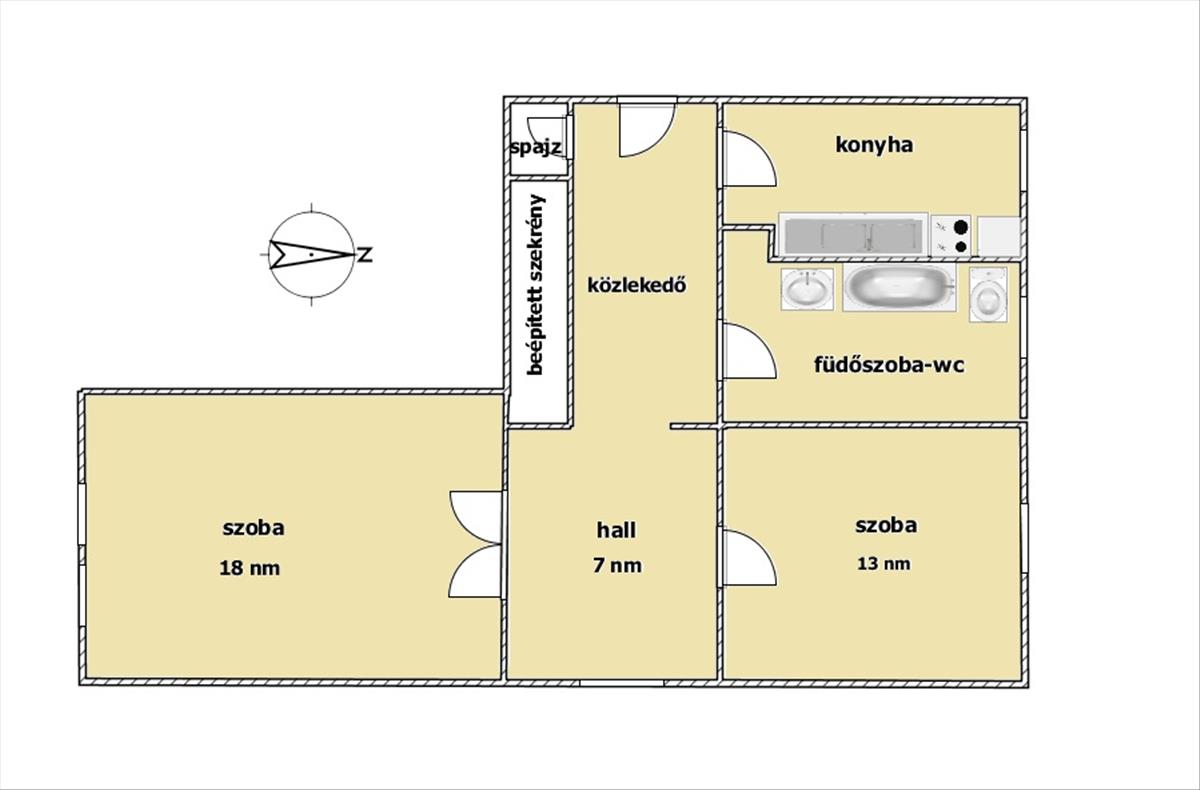 A lakás remek elosztással rendelkezik, két külön nyíló szobával, valamint étkező résszel és praktikus beépített szekrénysorral. a helységeket a nagyméretű ablakoknak köszönhetően mindenhol világos terek jellemzik.
