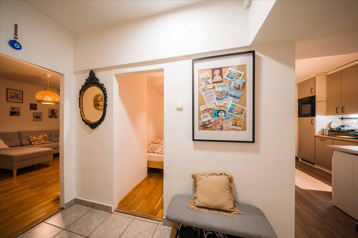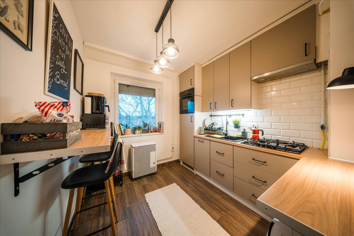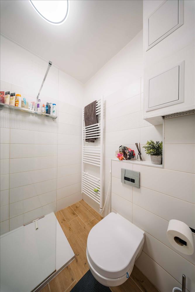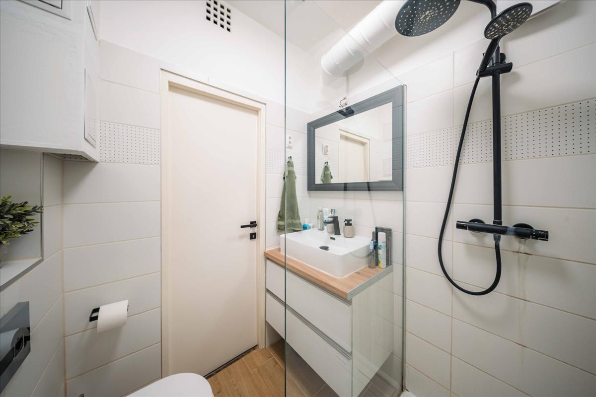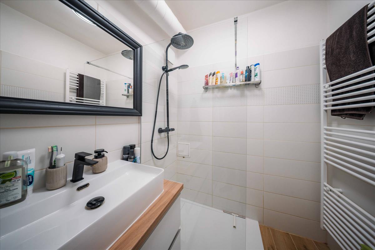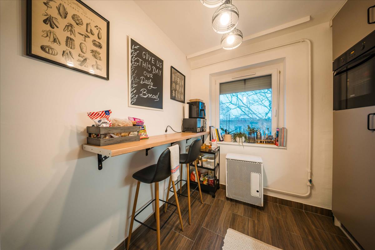 A közlekedő másik oldalán található a modern, egyedileg tervezett konyha, ahol a beépített gépek és az átgondolt bútorzat harmonikusan illeszkednek egymáshoz. Minden kézre áll, így a főzés itt nem feladat, hanem élmény. a konyha melletti fürdőszoba szintén teljes felújításon esett át: letisztult burkolatok, korszerű szaniterek és zuhanykabin teszik kényelmessé a mindennapokat.
