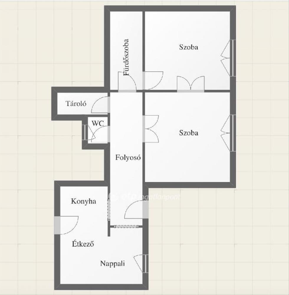 A lakás elrendezése: két tágas szoba, egy nappali és étkező, konyha, fürdőszoba és külön wc - mindez átgondolt, funkcionális térszervezéssel.