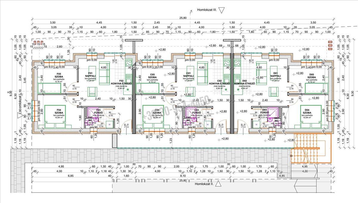 – Földszinti lakások: 91 m² + 26 m² terasz + kb. 100 M² saját kert