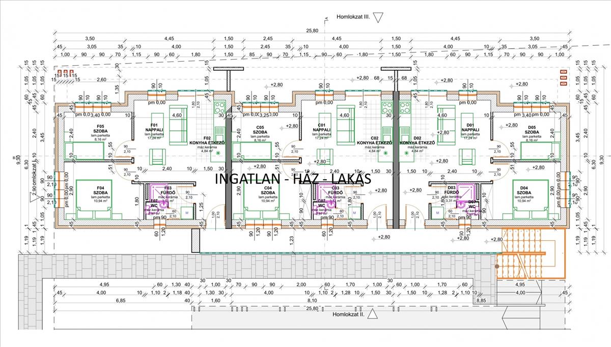 – Földszinti lakások: 45, 46 m² + 13 m² terasz + kb. 50 M² saját kert